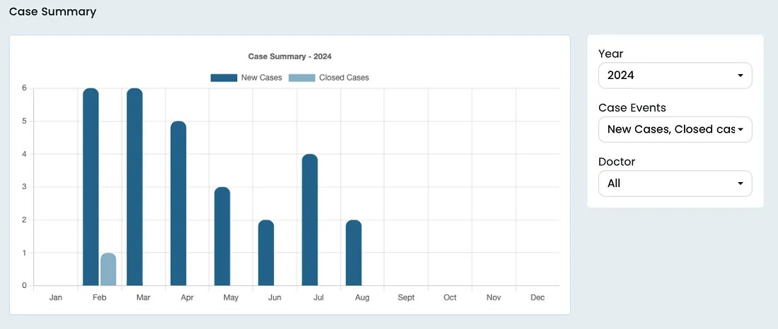 The graph which represents the number of new cases started each month helps you understand the effectiveness of the organic reach of your clinic as well as any marketing effort taken by you for your clinic. It can also help identify months that are colder so that they take necessary steps to ensure a steady flow of patients in those months.