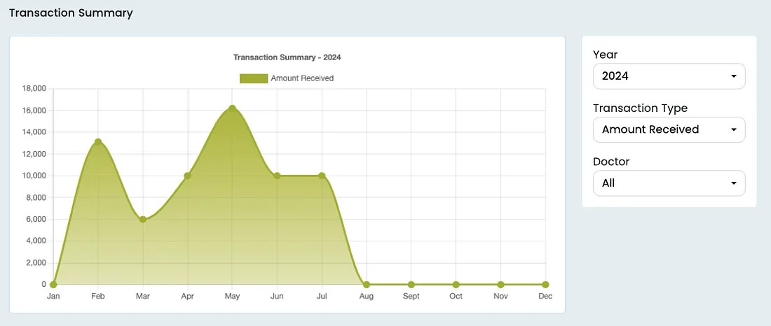 This is a graphical representation of the total amount received in each month. This allows the doctors to visualize their monthly income as well as compare it with the other months. Doctors can use this data to estimate and budget for impending expenses, as well as create reasonable goals for themselves.