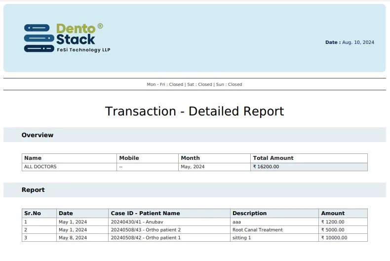 Reports are helpful when you need to understand the data in detail with more precision. Dentostack has three types of reports, i.e., Transaction Summary Report, Transaction Detailed Report Patient Due Report. First two reports provide information about the clinic’s cash flow and the last tell about the due amount with the patients.